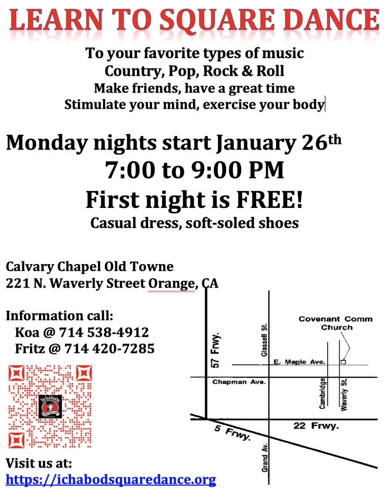 Beginner’s Class January 26, 2026 Screenshot Class of 2024 with Ichabod members, Calvary Chapel Old Towne, City of Orange Class of 2019 is seated in two front rows with Ichabod members behind. Calvary Chapel Old Towne, City of Orange Map for Calvary Chapel, Orange Instruction Demonstration Why Square dance? Fun!