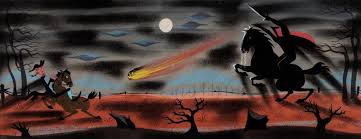 However, to Ichabod’s horror, the ghoul clambers over the bridge, rears his horse, and hurls his severed head into Ichabod’s terrified face. The schoolmaster attempts to duck beneath the terrible missile, but is too late when it strikes his head and sends him tumbling headlong into the dust. The next morning, Ichabod has mysteriously disappeared from town.